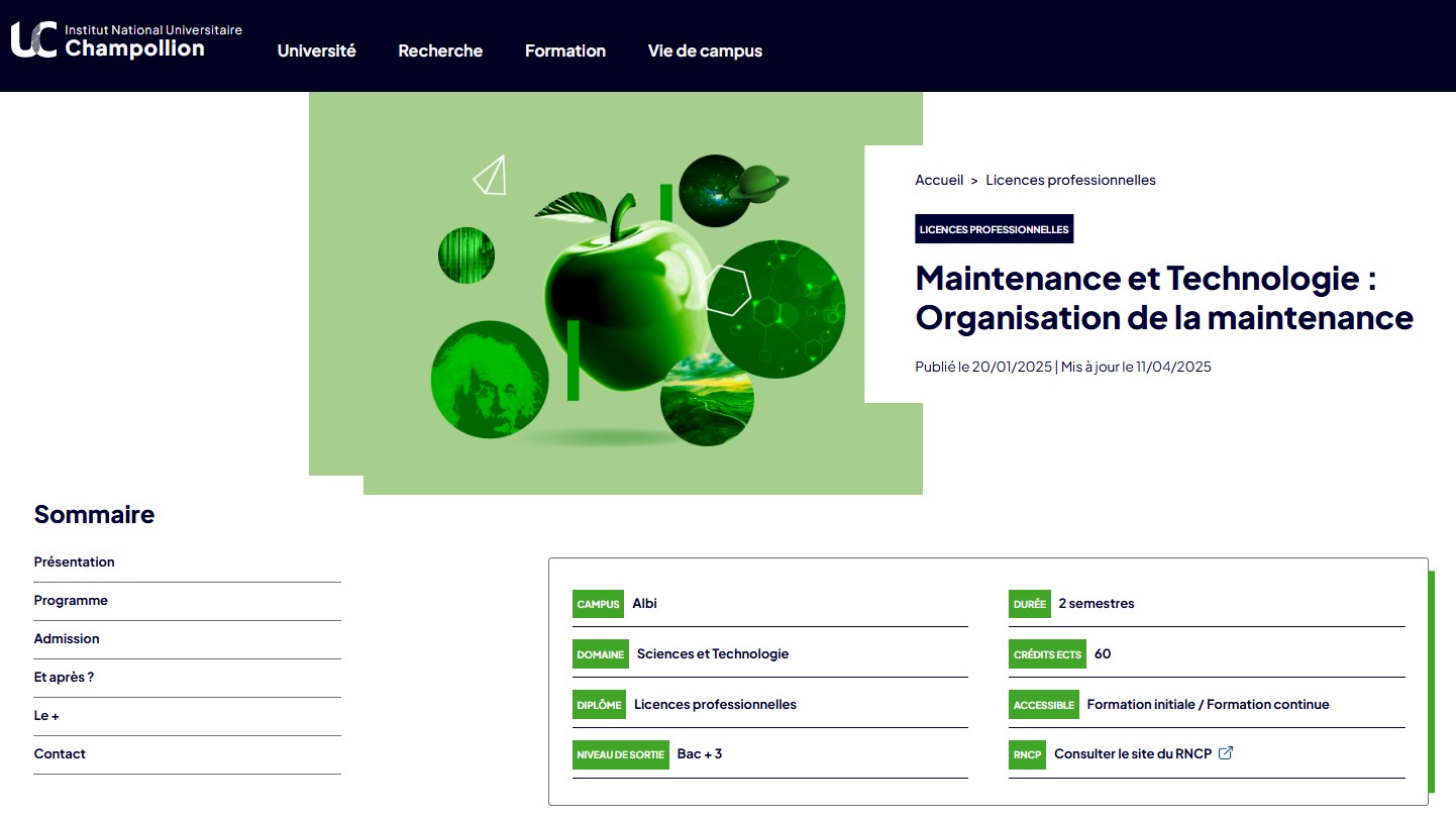 Programme : technologie des systèmes de maintenance, gestion de maintenance, management d’équipe, logiciel GMAO, interventions techniques, etc.