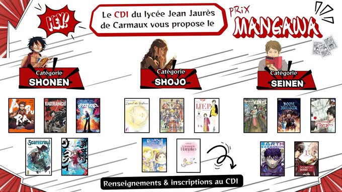 Par SYLVIE CHARDONNEAU, publié le lundi 17 novembre 2025 10:20 - Mis à jour le lundi 17 novembre 2025 10:20Le prix Mangawa c’est une sélection de 12 mangas : 4 shonens, 4 shojos et 4 seinens à lire ! Un vote aura lieu début avril pour déterminer lequel remportera le prestigieux Prix Mangawa. Venez vous inscrire au CDI !!! -